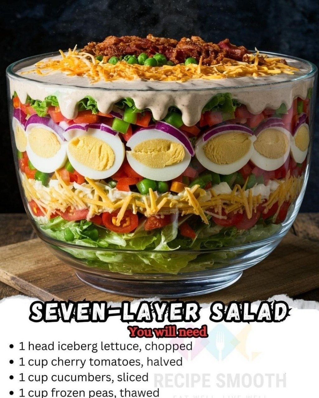 A Seven-Layer Salad is a traditional American dish that consists of seven distinct layers of ingredients, typically including lettuce, tomatoes, cucumbers, onions, peas, hard-boiled eggs, and cheese, topped with a creamy dressing and often garnished with crispy bacon. The layers create a beautiful presentation, making it a standout addition to any table.